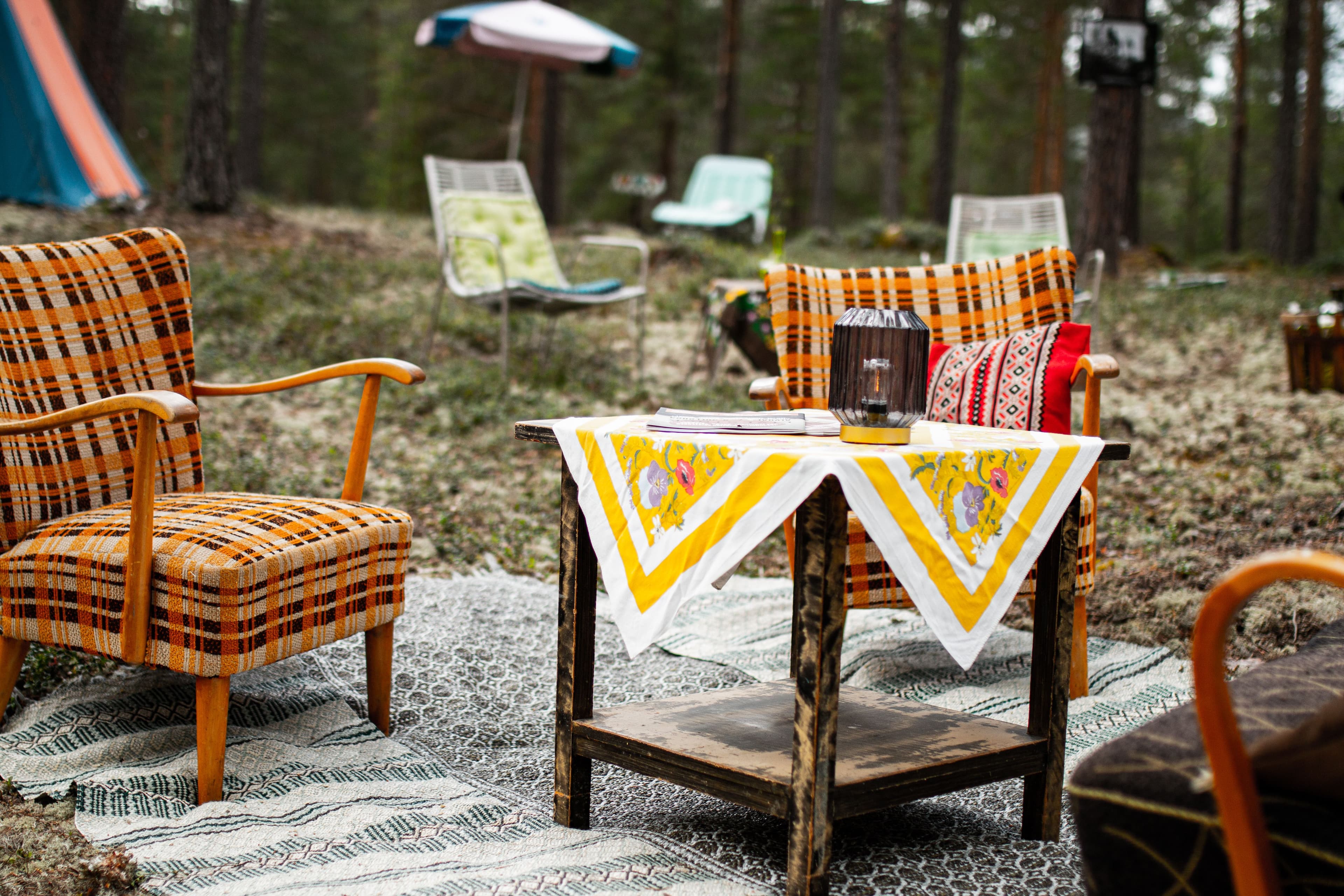 På Skogcampen er det mulighet for å reservere et ferdig innredet hustelt i retro 70-tallsstil med madrasser, stoler og bord. Det eneste man trenger å ta med for å overnatte der er egen sovepose.